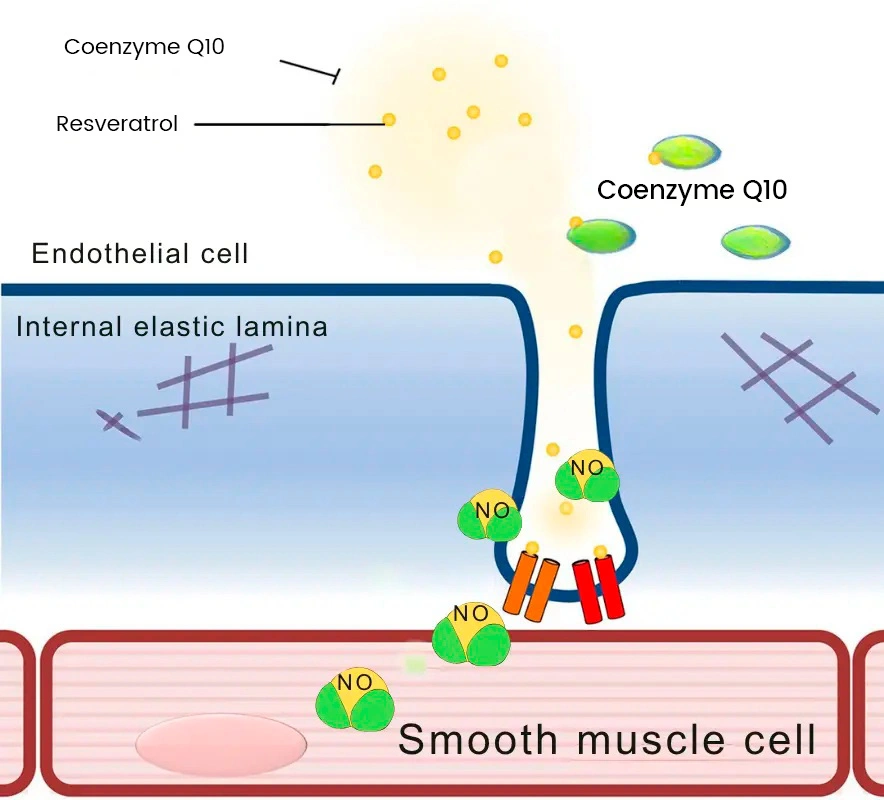 A precise synergy of Coenzyme Q10 and Resveratrol—two natural precursors proven to convert into nitric oxide directly in the endothelial layer.